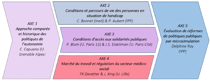 Cet axe de recherche se propose d’explorer les scénarios de réforme des politiques de l’autonomie. Il s’agit non seulement de considérer la cohérence d’ensemble (ou absence de) des prestations handicap / invalidité / dépendance et d’envisager les conséquences de réformes qui supprimeraient la barrière d’âge. Les chercheurs impliqués dans ce projet de recherche envisageront des scénarios d’uniformisation d’application des prestations (APA, ASH, PCH...) sur l’ensemble des départements et sur l’ensemble des lieux de vie (domicile, établissements. Il s’agira notamment d’évaluer les coûts et les effets redistributifs des solutions envisagées.